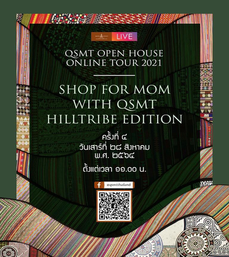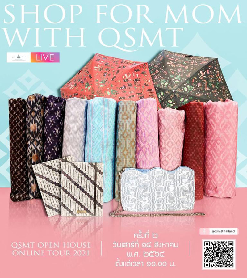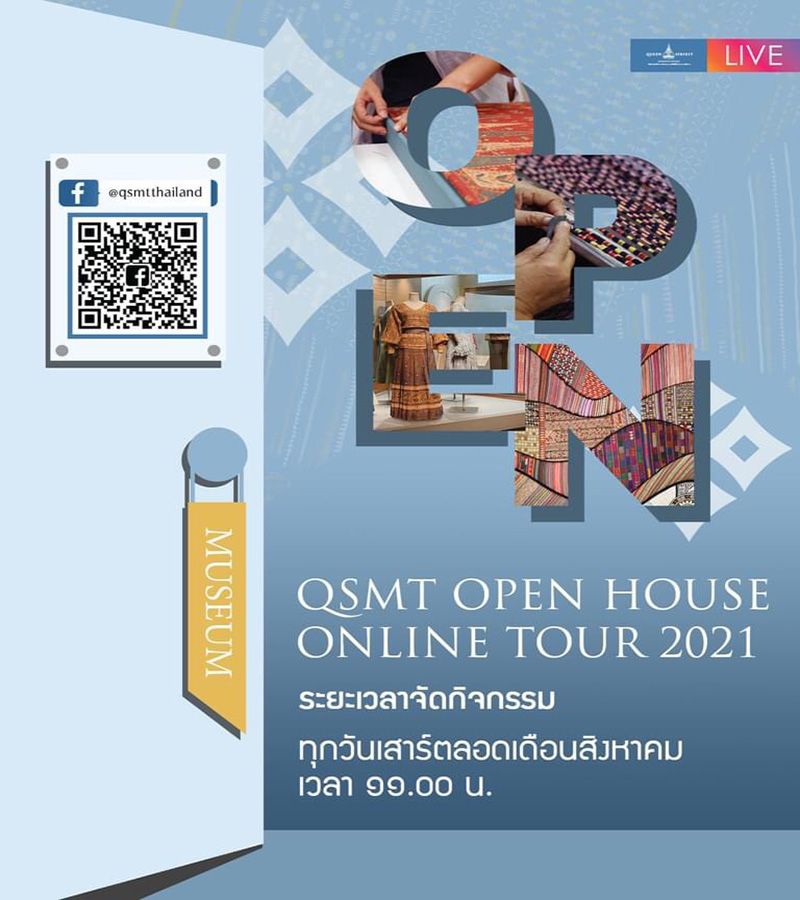 เนื่องในโอกาสมหามงคลเฉลิมพระชนมพรรษา สมเด็จพระนางเจ้าสิริกิติ์ พระบรมราชินีนาถ พระบรมราชชนนีพันปีหลวง และวันแม่แห่งชาติ ประจำปี 2564 พิพิธภัณฑ์ผ้าในสมเด็จพระนางเจ้าสิริกิติ์ พระบรมราชินีนาถ จะจัดกิจกรรม “QSMT OPEN HOUSE: ONLINE TOUR 2021” แบบออนไลน์ โดยจะพาทุกท่านไปทำความรู้จักกับงานเบื้องหลังของพิพิธภัณฑ์ผ้าฯ ทั้งความรู้ในงานอนุรักษ์ และเผยแพร่ภูมิปัญญาของบรรพบุรุษไทย ควบคู่ไปกับการเลือกชมและช้อปสินค้าจากพิพิธภัณฑ์ผ้า และมูลนิธิส่งเสริมศิลปาชีพฯ ทุกวันเสาร์ตลอดเดือนสิงหาคม โดยมีกิจกรรมที่น่าสนใจ ดังนี้