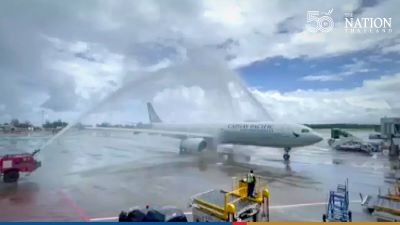 Cathay Pacific Airways’ Flight CX771 landed at Phuket International Airport at 10.40am on August 10. The flight was sprayed with water in a welcome ceremony.