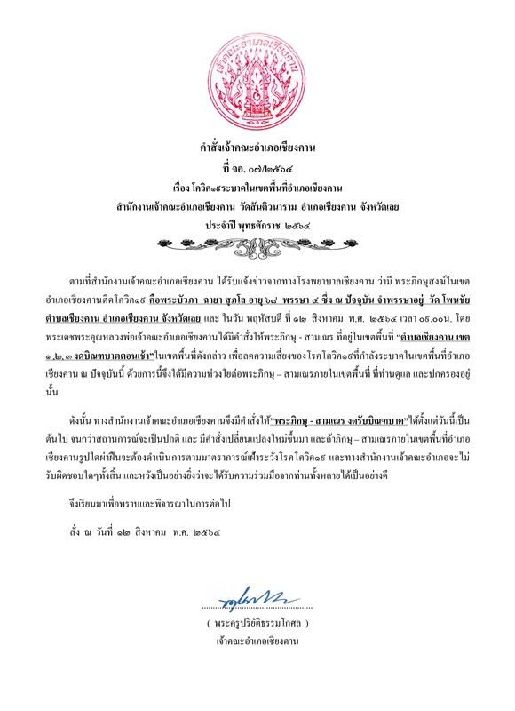 ล่าสุดพระครูปริยัติธรรมโกศล เจ้าคณะอำเภอเชียงคาน ได้ออกหนังสือคำสั่งเจ้าคณะอำเภอเชียงคาน เรื่องโควิด – 19 ในเขตพื้นที่อำเภอเชียงคาน ขอให้พระภิกษุ สามเณร งดบิณฑบาตในตอนเช้า หลังพบมีพระในอำเภอเชียงคาน ได้ติดเชื้อจากคลัสเตอร์นี้โดยได้มีหนังสือได้ระบุข้อความบางส่วนว่า ตามที่สำนักงานเจ้าคณะอำเภอเชียงคาน ได้รับแจ้งจากทางโรงพยาบาล ว่ามีพระภิกษุสงฆ์ในเขตอำเภอเชียงคานติดโควิด ซึ่งได้จำพรรษาอยู่ที่โพนชัย ตำบลเชียงคาน อำเภอเชียงคาน จังหวัดเลย อายุ 69 พรรษา ทางเจ้าคณะอำเภอเชียงคาน ได้มีคำสั่งให้พระภิกษุ สามเณร ที่อยู่ในเขตพื้นที่ตำบลเชียงคาน เขต 1,2,3 งดออกบิณฑบาตตอนเช้า ในพื้นที่ดังกล่าว เพื่อลดความเสี่ยงของโรคโควิด 19 ที่กำลังระบาดในพื้นที่อำเภอเชียงคาน