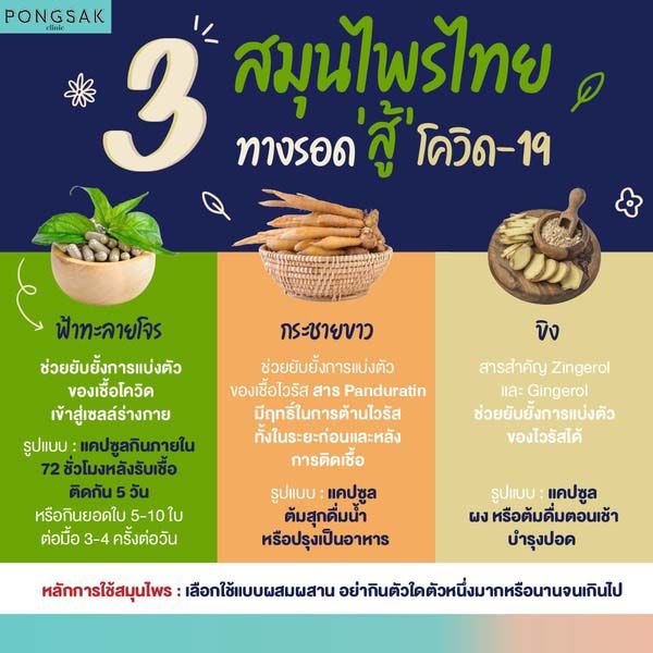 สำหรับ 3 สมุนไพร ทางรอดสู้ภัยโควิด-19 ประกอบด้วย 1.ฟ้าทะลายโจร ช่วยยับยั้งการแบ่งตัวของเชื้อโควิดเข้าสู่เซลล์ร่างกาย แบบแคปซูลกินภายใน 72 ชม.หลังรับเชื้อ ติดต่อกัน 5 วัน หรือกินยอดใบ 5-10 ใบต่อมื้อ 3-4 ครั้งต่อวัน 2.กระชายขาว ช่วยยับยั้งการแบ่งตัวของเชื้อไวรัส มีสาร Panduratin ช่วยในการต้านไวรัส ทั้งในระยะก่อนและหลังการติดเชื้อ มีทั้งแบบแคปซูล หรือต้มสุกดื่มน้ำ และปรุงเป็นอาหาร 3.ขิง มีสารสำคัญ Zingerol และ Gingerol ช่วยยับยั้งการแบ่งตัวของไวรัส มีทั้งแบบแคปซูล ผง หรือต้มดื่มตอนเช้าช่วยบำรุงปอด