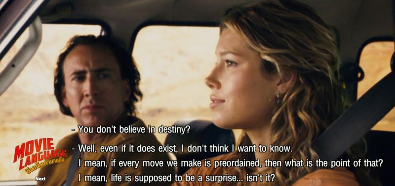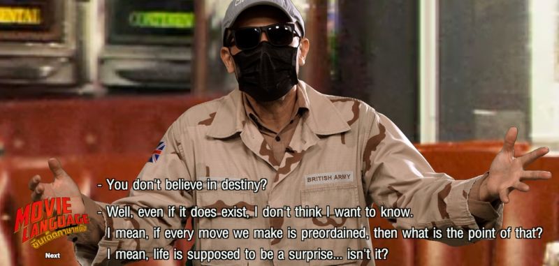 เต็มอิ่มไปกับศัพท์ดังประโยคเด็ดมากมาย ที่คอหนังคอภาษาไม่ควรพลาด อาทิการเปรียบเทียบการออกเสียงที่คล้ายกันของคำว่า “Neck (เน็ค) และ “Next (เน็คซท์)” ตัวอย่างคำ “Fate” (เฟท) / “Destiny” (เดส’ทินี) ที่มีความหมายเดียวกันว่า “โชคชะตา” หรือ “ชะตากรรม” รวมไปถึงตัวอย่างประโยคเด็ดจากนักแสดงของเรื่อง “เจสสิก้า บีล” ว่า “Well, even if it does exist, I don’t think I want to know. I mean, if every move we make is preordained, then what is the point of that? I mean, Life is supposed to be a surprise… isn’t it?” ความหมาย และการใช้คำเชื่อมของประโยคจะมีเทคนิกในการอ่าน, สังเกตุ และแปลความหมายออกมาว่าอย่างไร ติดตามได้ในรายการ “ซีนเด็ด…ภาษาหนัง (Movie Language)” ทุกวันอาทิตย์ที่ 15 ส.ค.2564 เวลา 17.55 น. ทางทีวีดิจิตอลหมายเลข 29 และ แอพพลิเคชั่น MONO29 http://bit.ly/2GE0XdR