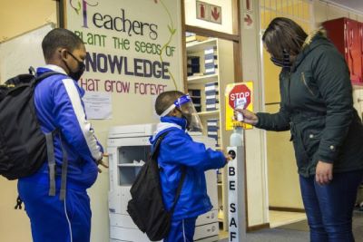 Students wait in line at the school gate for COVID-19 screening in Cape Town, South Africa, July 28, 2021.