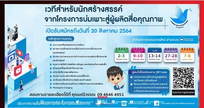จึงขอเชิญชวนผู้ผลิตสื่อและผู้ที่สนใจเข้าร่วม “โครงการพัฒนาศักยภาพผู้ผลิตสื่อ (บ่มเพาะ)” พร้อมส่งโครงการที่มีความคิดสร้างสรรค์ น่าสนใจและเกิดประโยชน์ต่อสังคม จะได้รับการคัดเลือกเข้าร่วมโครงการฯ เปิดรับสมัครถึงวันที่ 20 สิงหาคม 2564