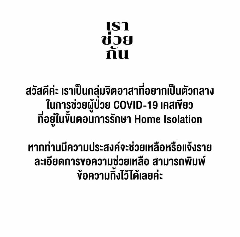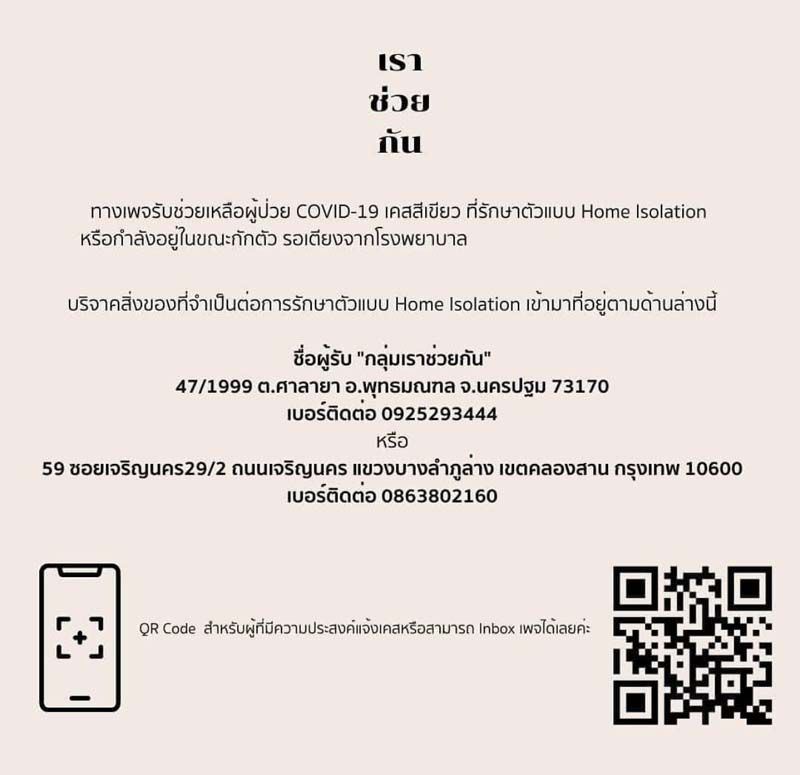สำหรับใครที่สนใจอยากร่วม และสนใจเกี่ยวกับเพจ “เราช่วยกัน” สามารถติดตามข่าวสาร และการเปิดรับบริจาคต่างๆ ได้ผ่านทางช่องทางบนหน้าเพจเฟซบุ๊ค “เราช่วยกัน” ได้เลยครับ พวกผมจะทำข้อความติดประกาศ และแจ้งข่าวให้ทุกคนได้รับทราบว่าตอนนี้ เราได้ช่วยไปแล้วเท่าไร สิ่งของที่ผู้ป่วยต้องการมีอะไรบ้าง ซึ่งเราก็จะคอยแจ้งให้ทราบในทุกๆ วัน ส่วนผู้ป่วยสีเขียวสามารถติดต่อทางข้อความเพจได้เลยครับ ตลอดเวลา เรามีคนคอยตอบคำถาม และพร้อมให้คำปรึกษาเสมอครับ