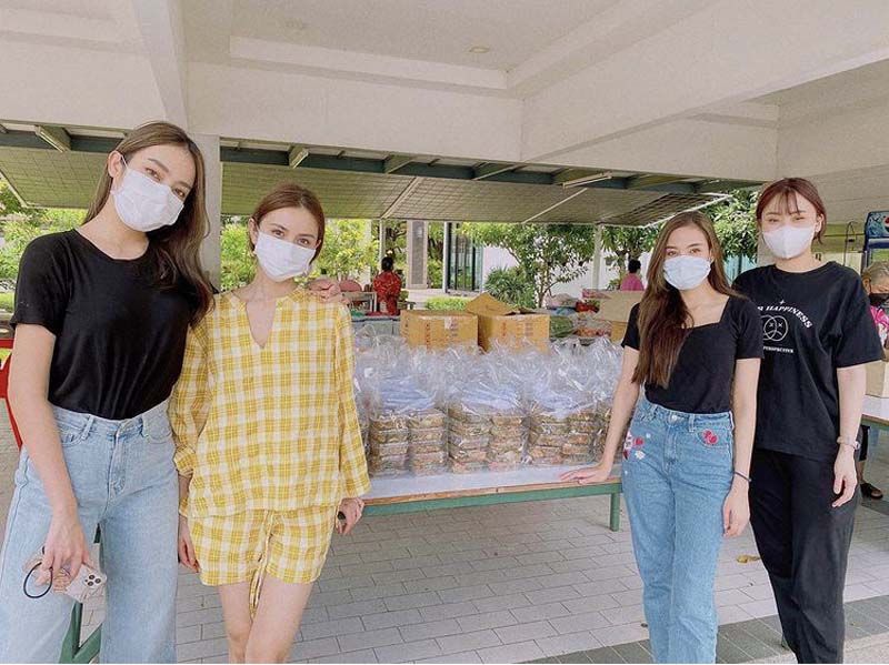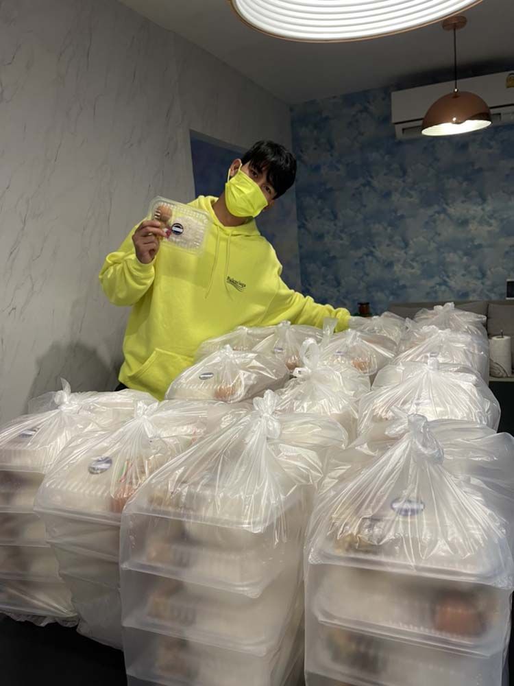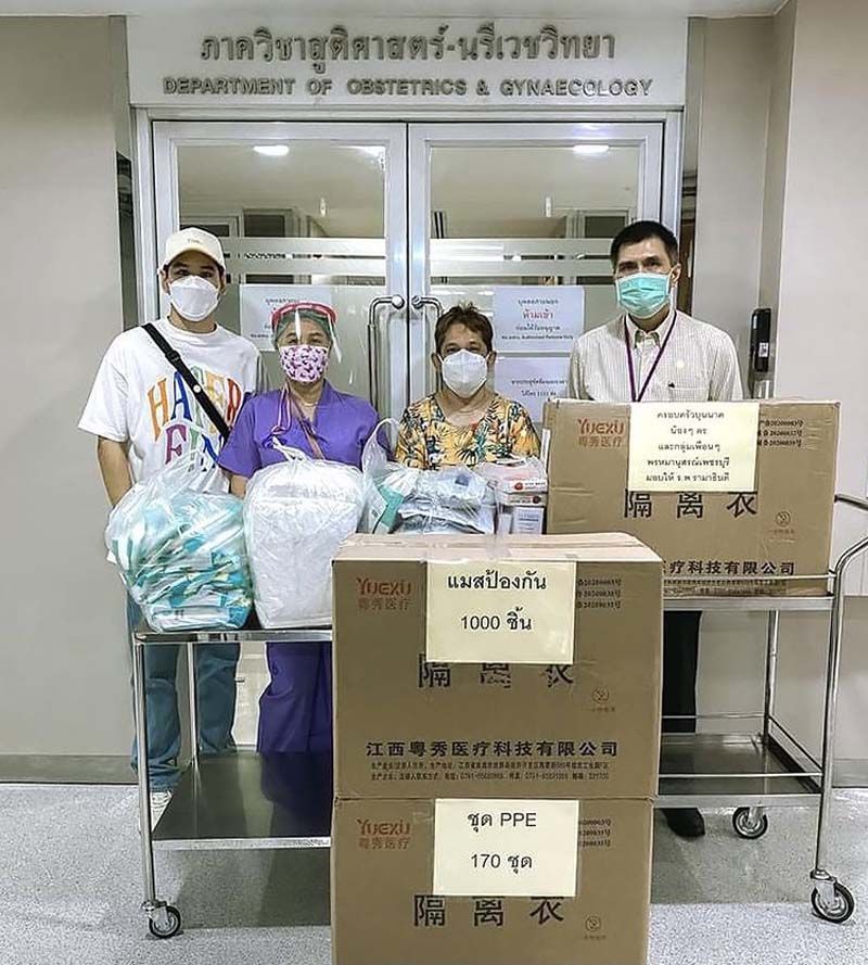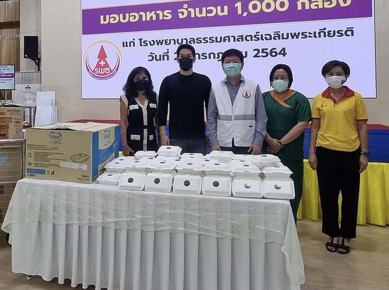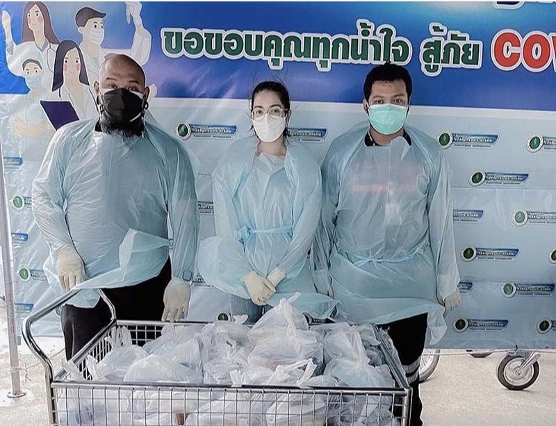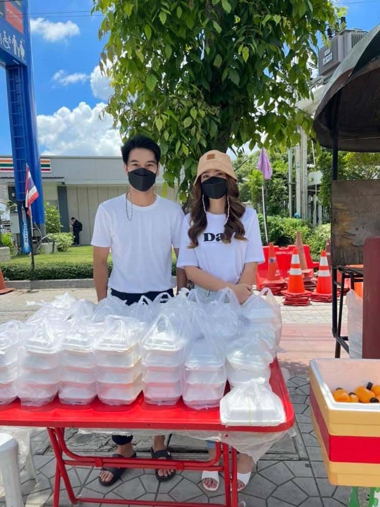 ส่วน อ้น-ณศรัณย์ จุมพลวิวัฒน์ รวมตัวกับเพื่อนๆ ทำกะเพราแฮมเบิร์กไข่เจียวญี่ปุ่น จำนวน 200 กล่อง มอบให้เจ้าหน้าที่บุคลากรทางการแพทย์และผู้ป่วยโควิด-19 ณ ศูนย์พักคอยเพื่อส่งต่อเขตบางนา ต่อกันที่หนุ่ม อั๋น-อัครพรรฒ บุนนาค พร้อมคุณแม่มอบชุด PPE และหน้ากากอนามัยให้บุคลากรทางการแพทย์โรงพยาบาลรามาธิบดีเพื่อใช้ในการดูแลผู้ป่วยโควิด-19 ส่วนหนุ่มโอ๊ต-รัฐธีร์ วรโรจน์โยธิน นำของจำเป็นมอบให้แคมป์คนงานที่ได้รับผลกระทบเช่นกัน มาที่กลุ่มนางเอกสาวเพื่อนสนิท เปรี้ยว-ทัศนียา การสมนุช, แม็กกี้-อาภา, แจมมี่-ปาณิชดา แสงสุวรรณ และ กุ๊กกิ๊ก-กชกร ส่งแสงเติม ทำข้าวกล่องไปมอบให้โรงพยาบาลสนาม ธรรมศาสตร์ แคมป์โรงงานลำลูกกาปิดท้าย ที่นางเอกหัวใจจิตอาสาสาวเกรซ-พัชร์สิตา อธิอนันตศักดิ์ที่เป็นอาสาสมัครดูแลผู้ป่วย ที่ศูนย์พักคอยเขตประเวศ และยังเข้าครัวทำข้าวกล่อง นำส่งชุมชนเคหะวัดพรพระร่วงประสิทธิ์ อีกด้วย