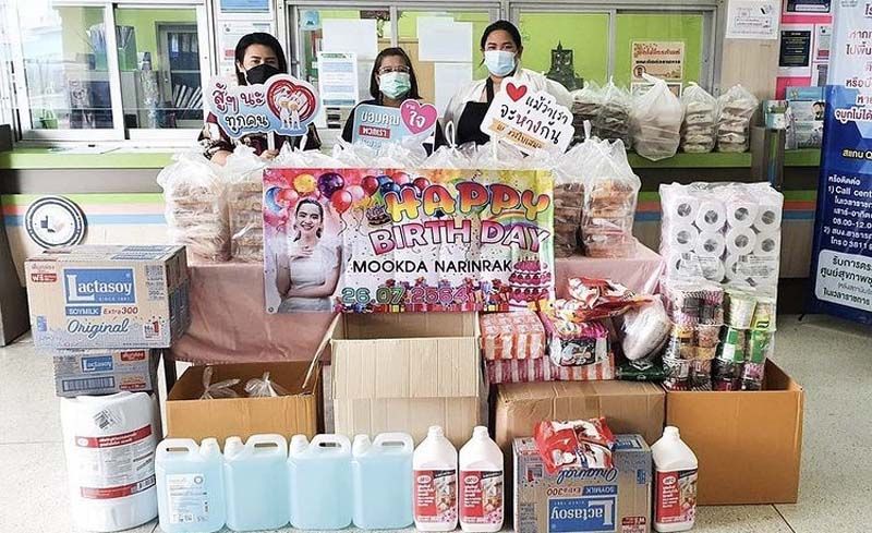 และด้าน มุกดา นรินทร์รักษ์ วันเกิดปีนี้ก็รวมใจกับแฟนคลับร่วมกันบริจาคของอุปโภค-บริโภคที่จำเป็นสำหรับบุคลากรทางการแพทย์เจ้าหน้าที่และผู้ป่วยโควิด-19 ณ โรงพยาบาลชลบุรี จ.ชลบุรี และยังมีแฟนคลับบ้านหัสรินทร์ ร่วมบริจาคของเพื่อช่วยคนงานที่แคมป์ย่านบางกรวยด้วย อ๊อฟ-ชนะพล สัตยา และ ฮาน่า ลีวิส จัดทำข้าวกล่องแจกฟรีให้กับผู้ที่เดือดร้อนย่านตัดใหม่-วัชรพล ส่วนพระเอกหนุ่ม จิณณ์-จิณณะ พร้อมเพื่อนๆ ทำข้าวกล่องจำนวน 410 กล่อง โดยส่งมอบเป็นมื้อกลางวันให้กับชุมชนลิขิต ด่านสำโรง จำนวน 210 กล่อง และมื้อเย็นให้กับชุมชนคลองมอญ จำนวน 200 กล่อง นอกจากนี้ ยังมีข้าวกล่องจำนวน 200 ชุดให้กับผู้ที่เดือดร้อนจากสถานการณ์ โควิค-19บริเวณชุมชนสุขาภิบาล 2 (โรงถ่าน)