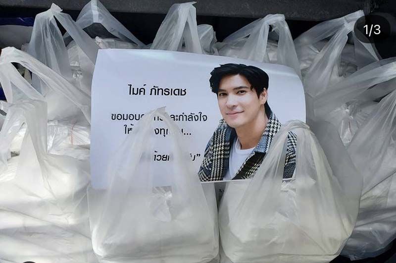 ส่วน มิกค์ ทองระย้า ร่วมกับเอ-ศุภชัย มอบข้าวกล่อง 300 กล่อง ให้แคมป์คนงานย่านเฉลิมพระเกียรติ 63 มาที่พระเอกฮอต เข้ม-หัสวีร์ ภัคพงษ์ไพศาล นอกจากส่งมอบหน้ากาก N95 และชุด PPE เพื่อสนับสนุนการทำงานของบุคลากรทางการแพทย์ ในการรักษาผู้ป่วยติดเชื้อโควิด-19 ให้กับ รพ.สต.ท่าสะอาด จ.บึงกาฬ จำนวน 300 ชุด และมอบชุด PPE ให้อนามัยบ้านหนองแข้ จ.ยโสธร 60 ชุด แล้วยังรวมตัวกับ 2 เพื่อนซี้ ยูโร-ยศวรรธน์ ทะวาปี และ เบน-สันติราษฎร์ กุลนพเกียรติ ร่วมกันแพ็กถุงยังชีพจำนวน 300 ชุด พร้อมข้าวกล่อง ขนม ให้กับผู้ป่วยโควิด-19 โดยบริจาคให้กับ พระครูสมุห์วัชระผู้ช่วยเจ้าอาวาส ณ วัดระฆังโฆสิตารามวรมหาวิหาร กรุงเทพมหานคร เพื่อส่งต่อให้กับชุมชนบางกอกน้อยและชุมชนใกล้เคียง อาทิ ชุมชนวัดดงมูลเหล็ก, ชุมชนวัดอัมพวา, ชุมชนวัดสีหไกรสร, ชุมชนซอยบ้านช่างหล่อ, ชุมชนวัดฉิมทายิกาวาส, ชุมชนวัดกัลยา, ชุมชนบ้านยอดมนัส 3 (บางพรม 37) ชุมชนข้างโรงเรียนพณิชยการราชดำเนิน