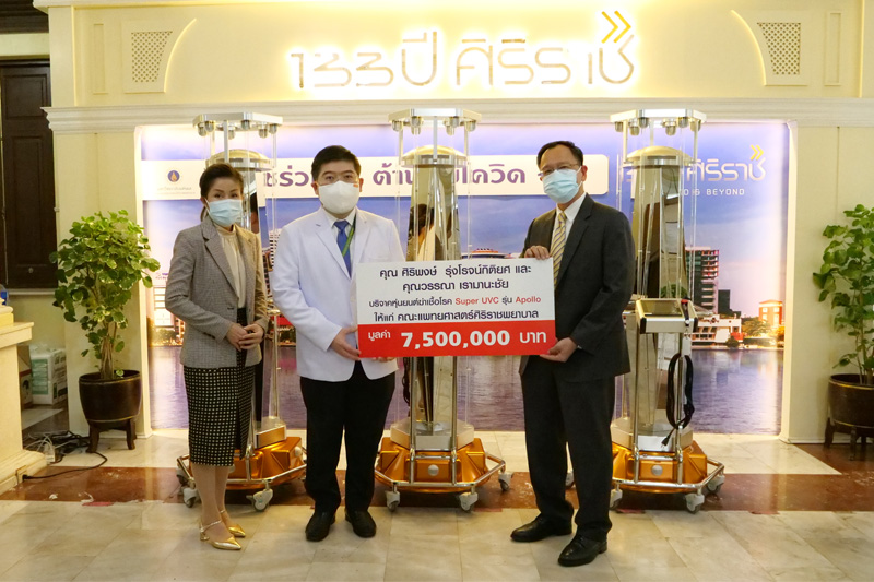 16 สิงหาคม 2564 บริษัท วิคตัส เอเธอนั่ม จำกัด (ViktasAeternum Co., Ltd.) ผู้นำด้านการจำหน่ายและผลิตเครื่องมือแพทย์ด้วยเทคโนโลยีชั้นสูงมานานกว่า 20 ปีนำโดย คุณพีบงค์ภัค ธนมาประสิทธิ์ ผู้อำนวยการและ คุณฐวีชัย รตนสิริวิทย์ผู้จัดการทั่วไปบริษัท วิคตัส เอเธอนั่ม จำกัด ได้ส่งมอบหุ่นยนต์ฆ่าเชื้อโรค Super UVC รุ่น Apollo จำนวน 2 เครื่อง มูลค่า 5,000,000 บาท และในโอกาสเดียวกัน คุณศิริพงษ์ รุ่งโรจน์กิติยศ และคุณวรรณา เรามานะชัยได้บริจาคหุ่นยนต์ฆ่าเชื้อโรครุ่นเดียวกันจำนวน 3 เครื่องมูลค่า 7,500,000 บาท ซึ่งเป็นเทคโนโลยีสุดล้ำที่พัฒนาขึ้นโดยวิศวกรคนไทย ผลิตในประเทศไทย ภายใต้โรงงานที่ทันสมัยและใช้เทคโนโลยีระดับโลก ให้แก่คณะแพทย์ศาสตร์ศิริราชพยาบาล โดยมี รศ.ดร.นพ.ยงยุทธ ศิริวัฒนอักษร รองผู้อำนวยการโรงพยาบาลศิริราช เป็นผู้รับมอบ เพื่อนำไปใช้ฆ่าเชื้อโรคภายในโรงพยาบาลศิริราชให้สามารถต่อสู้กับวิกฤตโควิด-19 ได้อย่างมีประสิทธิภาพมากยิ่งขึ้น