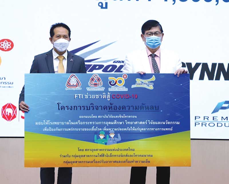 โดย ศ.ดร.สุรพล นิติไกรพจน์ เผยว่า ขณะนี้สถานการณ์การแพร่ระบาดของโควิด-19 ในประเทศไทยถือว่ายังหนัก มีตัวเลขผู้ติดเชื้อใหม่สูงขึ้น เฉพาะผู้ป่วยใน จ.ปทุมธานี มีจำนวนหลายร้อยคนต่อวันและ 1 ใน 3 คนจะมารักษาที่ รพ.ธรรมศาสตร์ ส่วนผู้มาตรวจหาเชื้อในแต่ละวันก็มีเป็นจำนวนมาก และกว่าร้อยละ 30 จะถูกตรวจพบว่าเป็นผู้ติดเชื้อและโรงพยาบาลก็ต้องรับมาดูแลรักษาต่อ ขณะที่บุคลากรทางการแพทย์ของธรรมศาสตร์ ได้กลายเป็นผู้ติดเชื้อไปแล้วกว่า 150 คน จากทั้งหมด 3.5 พันคน แม้เทียบสัดส่วนดูเหมือนจำนวนจะไม่มาก แต่การติดเชื้อของแต่ละคน ส่งผลกระทบต่อการทำงานมาก เพราะเราจะต้องกักตัวคนสัมผัสใกล้ชิดเป็นจำนวนมาก ซึ่งขณะนี้มีจำนวนกว่า 1 พันคนแล้ว วันนี้ทุกหน่วยในโรงพยาบาลจึงทำงานหนักมาก และเสี่ยงต่อการติดเชื้อทุกเวลา ที่สำคัญขณะนี้ผู้ป่วยที่เป็นทั้งโรคไตและโควิด-19 มีเพิ่มจำนวนมากขึ้นและจะต้องทำการฟอกไตครั้งละกว่า 4 ชั่วโมง ทำให้บุคลากรทางการแพทย์ ต้องใช้เวลาอยู่ในสภาพแวดล้อมเดียวกันตามไปด้วย การที่ อว.ร่วมกับ ส.อ.ท. นำห้องความดันลบมามอบให้ รพ.ธรรมศาสตร์ จึงเป็นความช่วยเหลือที่มาถูกที่ถูกเวลา ตรงกับเป้าหมายเพราะเราต้องรบกับโควิด -19 บุคลากรทางการแพทย์ต้องการอุปกรณ์ป้องกัน นอกเหนือจากหน้ากาก ชุด PPE หรืออื่นๆ ดังนั้น ห้องความดันลบจึงจำเป็นมาก เพราะจะทำให้สภาพแวดล้อมในการทำงานของบุคลากรทางการแพทย์ปลอดภัยมากขึ้น