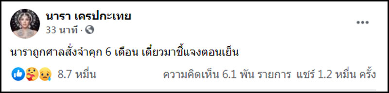 ล่าสุด เมื่อเวลา 14.24 น. นารา โพสต์ข้อความอีกครั้งว่า “นาราถูกศาลสั่งจำคุก 6 เดือน เดี๋ยวมาชี้แจงตอนเย็น” ซึ่งก็มีเพื่อนๆและแฟนคลับที่ติดตามเธอเข้าไปให้กำลังใจจำนวนมาก.jpg)