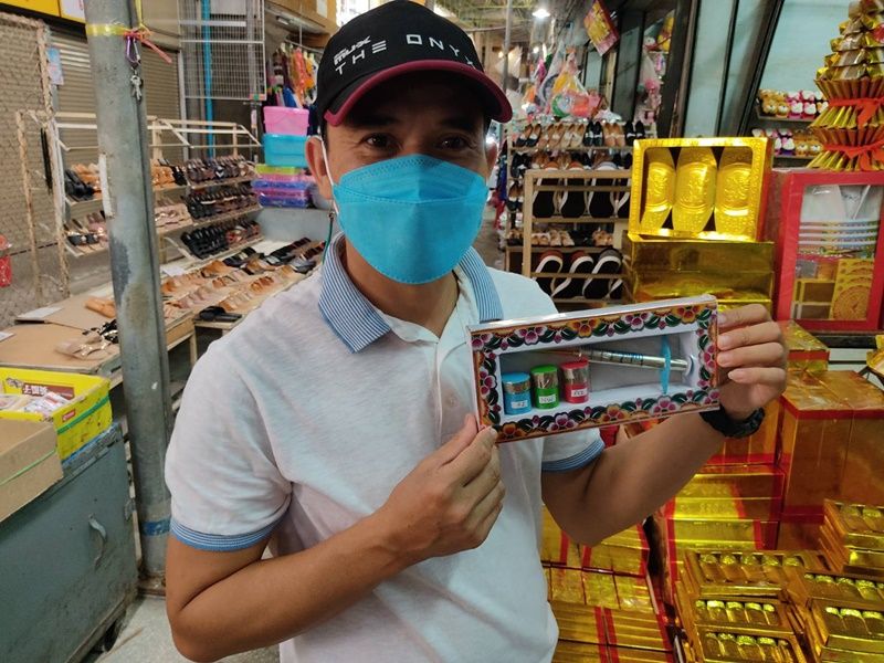วันที่ 21 ส.ค.64 ผู้สื่อข่าวรายงานว่า ที่ร้านตั้งตักเซ้งในตลาดสดอาเขตพะเยาเป็นร้านจำหน่ายเครื่องเซ่นไหว้บูชาเทพเจ้า บรรพบุรุษ บุคคลอันเป็นที่รักที่เสียชีวิตไปแล้วของชาวไทยเชื้อสายจีน จึงผุดไอเดียเรียกลูกค้า ทำกงเต๊กวัคซีนโดยใน 1 ชุดประกอบด้วยเข็มขนาดใหญ่ 1 อัน และขวดวัคซีน 3 สีให้เลือกยี่ห้อวัคซีนได้ตามที่ต้องการ ซึ่งสร้างความสนใจให้กับ คนไทยเชื้อสายจีนที่เข้ามาซื้อเครื่องเซ่นไหว้บูชาเทพเจ้า บรรพบุรุษในวันสารทจีนที่จะถึงนี้