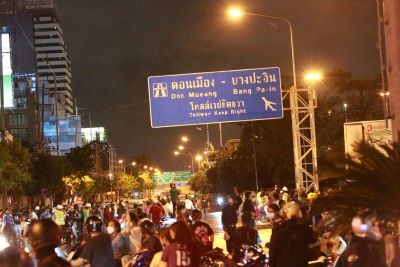 The Thalu Fah group protesters, who had gathered at Victory Monument on Sunday evening, blocked traffic until Din Daeng Junction. They reportedly threw firecrackers, flares and ping pong bombs at crowd-control police, who have been deployed in the areas to control the situation.