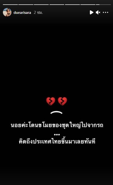 โดยสาวดิวได้เผยเรื่องราวนี้ลงในไอจีสตอรี่ของตัวเองพร้อมระบุข้อความว่า “นอยด์ค่ะ โดนขโมยของชุดใหญ่ไปจากรถ คิดถึงประเทศไทยขึ้นมาเลยทันที” ซึ่งความเสียหายที่เกิดขึ้นในครั้งนี้ แฟนหนุ่มเซบาสเตียน ได้ออกมาเปิดเผยชัดๆ อีกว่า ของมีค่าที่ถูกขโมยไปจากในรถนั้น ราคา 3 หมื่นเหรียญสหรัฐ ซึ่งตีเป็นเงินไทยแล้ว การสูญเสียครั้งนี้ มีค่านับล้านบาทเลยทีเดียว