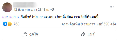มายไม่รู้ว่าด้านอื่น ๆ เป็นยังไงบ้าง แต่ด้านที่ตัวเองรับรู้ตอนนี้มายก็ต้องยอมรับกับความจริงที่เกิดขึ้น พยายามตั้งสติและรับฟังกับทุกเรื่องราว การที่ไม่พูดคุยกันหรือไม่ติดต่อกันมันทำให้เกิดเรื่องที่น่าเสียใจและน่ารู้สึกผิดถึงขั้นนี้ มันคงเป็นเรื่องยากที่จะให้อภัยตัวเอง คงไม่มีทางให้อภัยตัวเองได้ไปตลอด รวมไปถึง สำหรับเรื่องเงินและเจ้าหนี้ทุกคน มายก็ต้องยอมรับข้อผิดพลาดของตัวเอง ณ จุดนี้ ตอนนี้มายไม่สามารถจะจัดการได้อย่างครบถ้วนสมบูรณ์ มายต้องยอมรับว่าตอนนี้มายล้มเหลว แต่ไม่ใช่ว่าล้มแล้วจะไม่สู้ต่อ ไม่ลุกขึ้น ยังสู้และพยายามต่อ แค่ต้องขอโอกาสในการหาเงินสักพักหนึ่ง ตอนนี้มายยังมีงานทำอยู่ มายยังพยายามแก้ปัญหานี้อยู่ ไม่ได้ละทิ้งหนีไปไหน ทั้งด้วยการทำงานที่ไม่สามารถเอาเรื่องส่วนตัวไปเกี่ยวข้องได้ หรือแม้แต่การรับตัวเองไม่ได้จนไม่ค่อยได้คุยกับใคร รู้สึกไม่ดีกับตัวเองมาก ๆ ไม่กล้าแม้แต่จะคุยกับตัวเอง รู้สึกละอายใจกับตัวเองที่ก่อปัญหาขึ้นมา เป็นต้นตอของความเสียใจต่อตัวเองและผู้อื่น ทั้งหมดนี้ ต้องขอโทษจริง ๆ ขอให้เป็นที่ทราบกันว่า จะพยายามแก้ไขปัญหาตรงนี้ให้ได้สำเร็จ แต่จำเป็นต้องเคลียร์ไปทีละเคส ด้วยความพยายามและตั้งใจที่จะทยอยปิด จะพยายามทยอยปิดให้เป็นเคสๆ ไปนะคะ ต้องขอโทษอีกครั้ง ที่ปล่อยให้เหตุการณ์มันเลยมาจนถึงจุดนี้ ด้วยความไม่ตั้งใจและไม่สามารถแก้ปัญหาได้ด้วยความผิดพลาดของตัวเอง ยินดีและยินยอมจะแก้ไขปัญหาอื่น ๆ และรับผิดชอบต่อสิ่งที่เกิดขึ้นอย่างเต็มความสามารถที่จะทำได้ในตอนนี้ค่ะ ด้วยความรู้สึกผิดต่อตราบาปในใจไปตลอด และด้วยความรู้สึกขอโทษอย่างจริงใจ โดยไม่ต้องการการให้อภัยใดใดต่อการกระทำที่เกิดจากความเลวร้ายของตัวเอง ขอให้มันเป็นเครื่องติดตัวติดใจไปตลอดอย่างรู้สึกผิดไม่มีวันเสื่อมคลาย