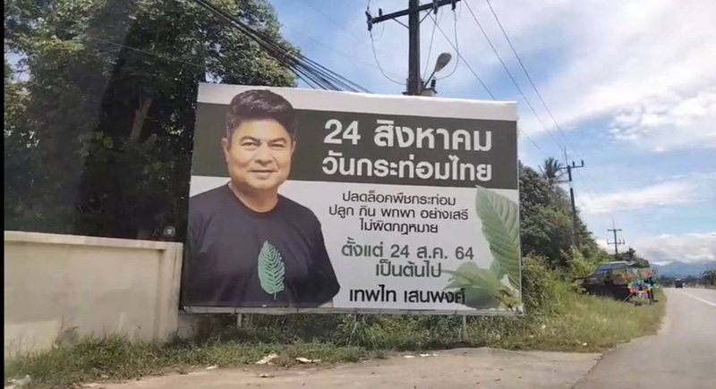 ผู้สื่อข่าวรายงานอีกว่า ขณะที่หน้าบ้านนายเทพไท เสนพงศ์ อดีต สส.นครศรีธรรมราช พรรค ปชป. มีการนำป้ายไวนิวส์ขนาดใหญ่ขึ้นภาพ พร้อมระบุข้อความ ’24 สิงหาคม วันกระท่อมไทย ปลดล็อคพืชกระท่อม ปลูก กินพกพา อย่างเสรี ไม่ผิดกฎหมาย ตั้งแต่วันที่ 24 ส.ค.64 เป็นต้นไป’