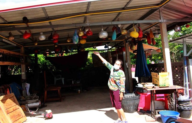 นางประกอบกล่าวอีกว่า การระบาดของโรคติดเชื้อโควิด-19 ในรอบแรกและรอบ 2 การค้าขายไปได้เรื่อยๆ แต่พอระบาดหนักในรอบที่ 3 ที่ 4 กระทบต่อการค้าขายมาก รายได้จากการค้าขายแทบจะเป็นศูนย์ พืชผักผลไม้ เช่น กล้วย แตงโม ฝรั่ง หน่อไม้ มะม่วง ผักสวนครัวต่างๆตกค้าง ขายไม่ออก รวมทั้งน้ำเต้าที่ตนปลูกไว้หลังบ้านก็ขายไม่ได้ จึงเป็นผลแก่ที่ใช้ทำอาหารไม่ได้อีกด้วย ที่พอจะพอขายได้เรื่อยๆหน่อยคือน้ำมันหยอดเหรียญ ทั้งนี้ จากผลกระทบดังกล่าว และตนเห็นลูกน้ำเต้าแก่ ไม่ได้ขาย เก็บไว้ไม่ได้ประโยชน์ จึงเกิดไอเดีย นำมาเพ้นท์สีต่างๆ แล้วนำมาแขวนไว้ภายในร้าน เป็นการสร้างสีสัน ซึ่งปรากฏว่า ได้รับความสนใจจากชาวบ้าน และลูกค้าแวะเวียนเข้ามาชมว่าสวยดี พลอยให้การค้าขายพืชผักผลไม้ดีขึ้นด้วย