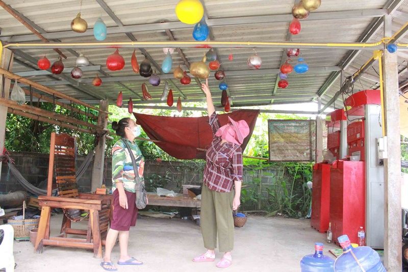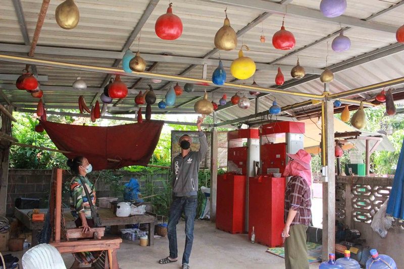 ผู้สื่อข่าวจึงได้ลงพื้นที่พบบ้านหลังดังกล่าว เลขที่ 98 หมู่ 19 บ้านตูม ต.บัวบาน อ.ยางตลาด จ.กาฬสินธุ์ มีนางประกอบ ภูศรีดาว อายุ 60 ปี เป็นเจ้าของบ้าน ซึ่งได้จัดบริเวณหน้าบ้านเป็นตู้เติมน้ำมันแบบหยอดเหรียญ ตู้เติมเงินโทรศัพท์ และแผงขายพืชผักผลไม้พื้นบ้าน ทั้งนี้พบว่าขณะที่ผู้สื่อข่าวเข้าไปพูดคุยถึงความเป็นมา ของการนำลูกน้ำเต้าเพ้นท์สีและประดับร้าน มีลูกค้าทยอยมาใช้บริการเติมน้ำมัน พร้อมเลือกซื้อสินค้าและเข้ามาชมน้ำเต้าหลากสีเป็นระยะ เป็นการการันตีว่า การค้าขายดีขึ้นเพราะมีน้ำเต้าเรียกลูกค้า