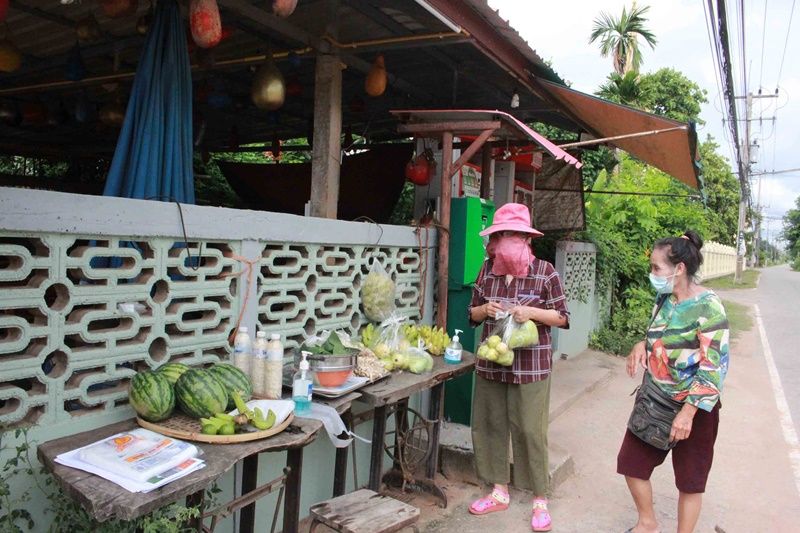 นางประกอบ ภูศรีดาว อายุ 60 ปี เจ้าของบ้านกล่าวว่า ตนเปิดหน้าร้านให้บริการตู้น้ำมันหยอดเหรียญมาประมาณ 20 ปี จากนั้นจึงเริ่มมีตู้เติมเงินโทรศัพท์ตามมา แต่ในส่วนของการตั้งแผงขายพืชผักผลไม้ เพิ่งจะมีเสริมเข้ามาเมื่อไม่นานมานี้ เนื่องจากเกิดสถานการณ์แพร่ระบาดของโรคติดเชื้อโควิด-19 เพราะตลาดสด หรือตลาดนัดชุมชนปิดตัวลง เพื่อนบ้านที่เป็นพ่อค้า แม่ค้า ไม่มีตลาดวางจำหน่ายสินค้า จึงได้นำผลผลิตจากสวนเกษตร มาฝากให้ตนขายช่วย พอมีรายได้เสริมเข้ามา