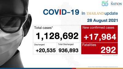 Thailand logged 17,984 new Covid-19 cases with 292 deaths over 24 hours on Saturday, rising to 30th among countries with the most number of cases.