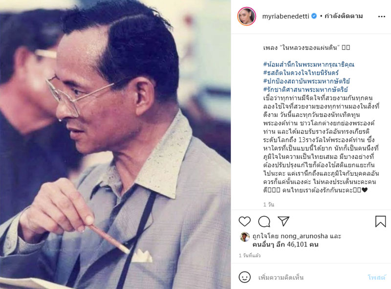 นัท มีเรีย ดารา-นักร้องสาวเสียงดี ก็ได้ออกมาโพสต์ผ่านอินสตาแกรม myriabenedetti ภาพในหลวง รัชกาลที่ 9 พร้อมกับข้อความว่า