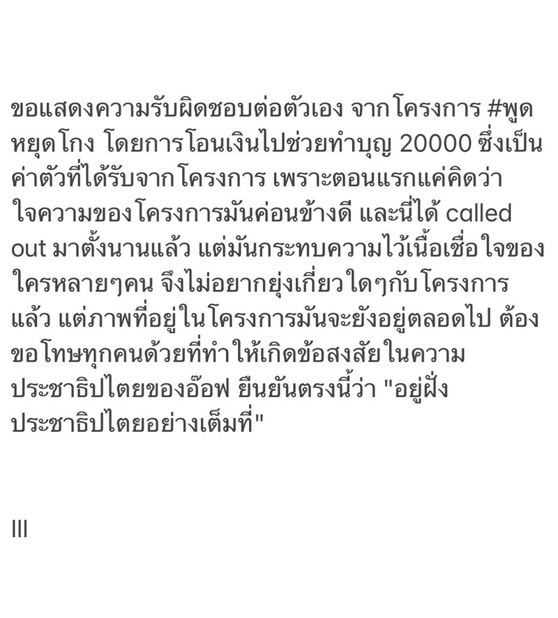โดย อ๊อฟ ได้โพสต์ข้อความว่า “ขอแสดงความรับผิดชอบต่อตัวเอง จาก โครงการ #พูดหยุดโกง โดยการโอนเงินไปช่วยทำบุญ 20,000 ซึ่งเป็นค่าตัวที่ได้รับจาก โครงการ เพราะตอนแรกแค่คิดว่าใจความของโครงการมันค่อนข้างดี และนี่ได้ called out มาตั้งนานแล้ว แต่มันกระทบความไว้เนื้อเชื่อใจของใครหลายๆ คน จึงไม่อยากยุ่งเกี่ยวใดๆ กับโครงการแล้ว