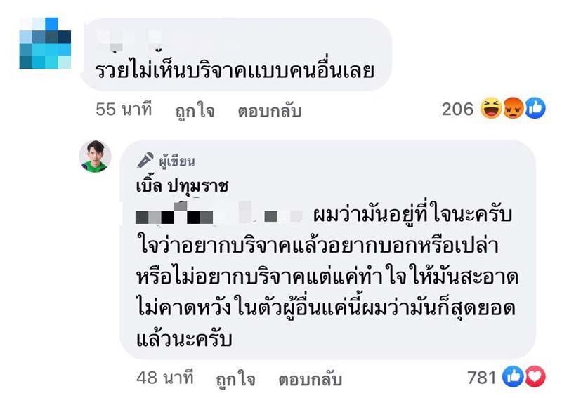 จริงๆ แล้วมีเยอะนะครับ ส่วนใหญ่คนที่ไปคอนเมนต์ว่า ทำไมคุณรวย คุณมีชื่อเสียง คุณถึงไม่บริจาคของ ผมว่าจริงๆ แล้ว กลุ่มคนพวกนี้เราต้องดูที่มาที่ไปของเขาด้วย บางคนเขาอาจจะสร้างเฟซบุ๊คเป็นอวตาร เพื่อมาปั่นให้เรารู้สึกว่าอยากโมโหกับเขา แต่บางคนเขาก็อาจจะไม่รู้ว่าเราทำหรือไม่ทำ เพราะฉะนั้นเบิ้ลเชื่อว่าการที่เราทำหรือไม่ทำ เรารู้ตัวเรา เราไม่จำเป็นที่จะไปบอกเขาหรือไปคาดหวังอะไรในตัวผู้อื่น เราทำด้วยตัวของเราเองดีกว่า