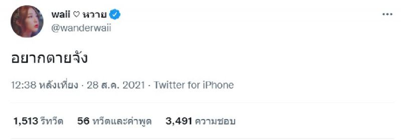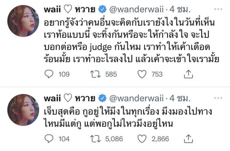 นอกจากนั้นแล้ว หวาย ปัญญ์ธิษา ก็ยังได้ทวีตข้อความเพิ่มเติมเพื่อสอบถามความเห็นของทุกๆ ที่ติดตามเธอด้วยว่า “อยากรู้จังว่าคนอื่นจะคิดกับเรายังไงในวันที่เห็นเราท้อแบบนี้ จะทิ้งกันหรือจะให้กำลังใจ จะไปบอกต่อหรือ judge กันไหม เราทำให้เค้าเดือดร้อนมั้ย เราทำอะไรลงไป แล้วเค้าจะเข้าใจเรามั้ย”
