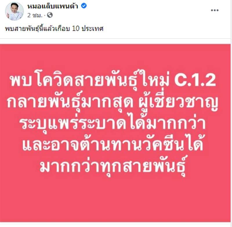 วันที่ 31 สิงหาคม 2564 หมอแล็บแพนด้า หรือ ทนพ.ภาคภูมิ เดชหัสดิน นักเทคนิคการแพทย์ หัวหน้างานตรวจโรคติดเชื้อทางโลหิตวิธีอณูชีววิทยาศูนย์บริการโลหิตแห่งชาติ สภากาชาดไทย ได้โพสต์ภาพข้อความผ่านเฟซบุ๊กว่า “พบโควิดสายพันธุ์ใหม่ C.1.2 กลายพันธุ์มากสุด ผู้เชี่ยวชาญระบุแพร่ระบาดได้มากกว่า และอาจต้านทานวัคซีนได้มากกว่าทุกสายพันธุ์”