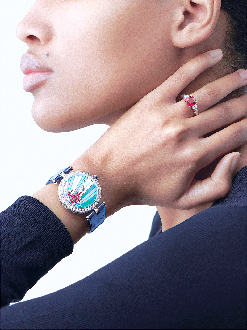 บนหน้าปัดของงานออกแบบนาฬิกา Lady Danse นางระบำปลายเท้าเจ้าของวงหน้าเพชรเดี่ยวกำลังเตรียมพร้อมก้าวออกไปสู่เวทีการแสดง ด้วยแรงบันดาลใจจากแฟชั่นการแต่งกายระหว่างทศวรรษ 1950 ถึง 1960 ชุดเดรสที่เธอสวมรองรับงานฝังทับทิม และใช้ทองคำต่างงานเดินขอบขลิบริมกระโปรงเพื่อร่วมกันจำลองความพลิ้วไหวของน้ำหนักผ้าบางเบาระหว่างเธอเตรียมออกท่าวาดลวดลายการเต้น พร้อมกับเผยให้เห็นงานจิตรกรรมย่อส่วนบนรองเท้าที่ช่วยเติมเต็มความครบครัน เรือนร่างประติมากรรมนูนต่ำของเธอ โดดเด่นตัดกับฉากหลังพื้นหน้าปัด ซึ่งอาศัยเทคนิคฝังแผ่นรัตนชาติปูพื้นก่อทรวดทรงสามมิติ ในการดำเนินเทคนิคอันละเอียดอ่อนเช่นนี้ ไม่ว่าจะเป็นแผ่นแม่มุกมาเธอร์-ออฟ-เพิร์ล, หินเทอร์คอยซ์ และโมราสีเขียวคริโซเพรส ล้วนผ่านการตัดเจียนเป็นแผ่นบางในขนาดซึ่งผ่านการคำนวณอย่างแม่นยำให้สามารถนำมาบรรจงวางเคียงกันได้อย่างสม่ำเสมอ และไล่ระดับความกลมกลืนเพื่อก่อมิติความลึก ทวีความโดดเด่นให้แก่อากัปการเคลื่อนไหวของนางระบำปลายเท้า การแสดงของเธอยังต่อเนื่องมาสู่ด้านหลังตัวเรือนนาฬิกาซึ่งใช้ศิลปะการสลักลวดลายเล่าเรื่องราวที่ปรากฏอยู่บนหน้าปัดได้อย่างคล้องจอง