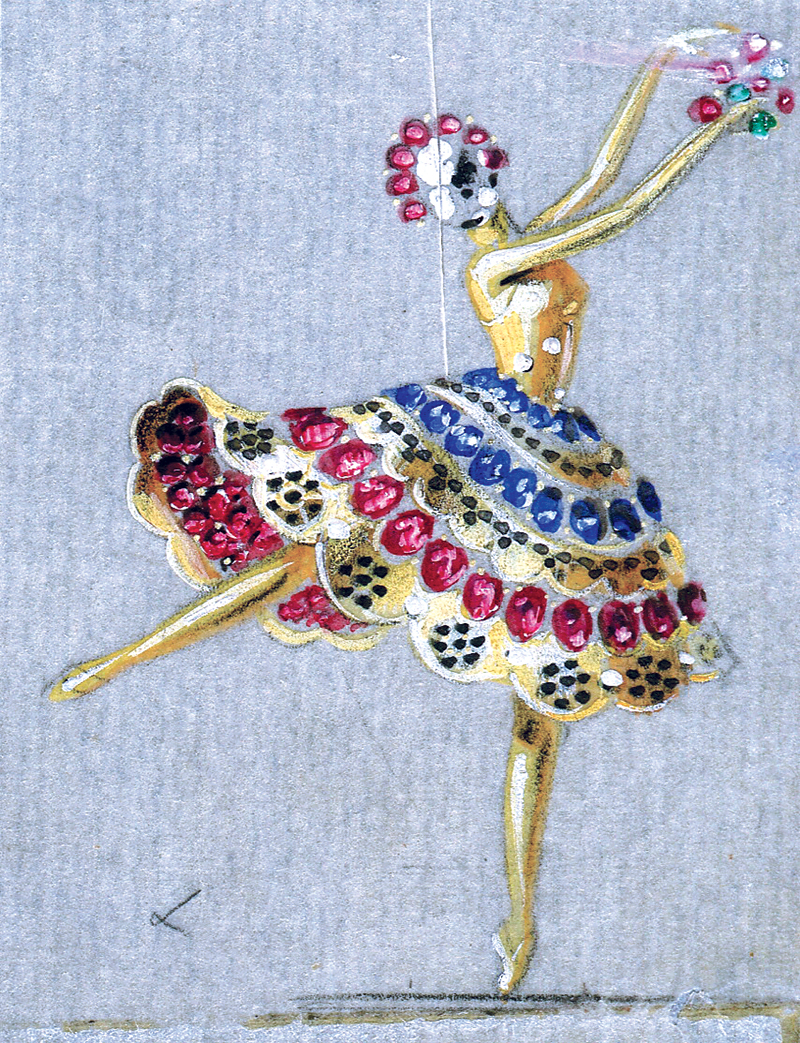 สายใยแห่งความผูกพันระหว่างVan Cleef & Arpels กับศิลปะการเต้น มีจุดเริ่มต้นขึ้นเมื่อทศวรรษที่ 1920 ในกรุงปารีส ลูอิสอารเปลส์ ผู้รักการแสดงบัลเลต์เป็นชีวิตจิตใจ มักจะพาโคลด หลานชายของตนไปยังโรงอุปรากรปาแลการนีเยซึ่งอยู่ห่างจากบูติกที่จัตุรัสว็องโดมไปไม่กี่ก้าว ส่วนเข็มกลัดนางระบำหรือที่เรียกกันว่า “บัลเลรินา คลิป” (ballerina clip) ชุดแรกของเมซงนั้น ก็ได้รับการสร้างสรรค์ขึ้นในช่วงต้นทศวรรษ 1940 และกลายเป็นผลงานสัญลักษณ์ประจำ Van Cleef &Arpels ในเวลาอย่างรวดเร็ว ท่วงท่าที่ดูคล่องแคล่ว และอ่อนช้อย ร่วมกับความงดงามของเครื่องแต่งกายบนเข็มกลัดเหล่านี้ สะกดสายตา และจุดอารมณ์ปรารถนาให้ครอบครองขึ้นในใจของบรรดานักสะสมทั้งหลายได้ทันที วงหน้าที่เผยเนื้อทองของตัวเรือน หรือใช้เพชรเดี่ยวเจียระไนอย่างประณีต ได้รับการเติมเต็มด้วยเครื่องประดับศีรษะอันเลอค่า เช่นเดียวกันกับรองเท้าหัวแหลม และกระโปรงบาน ฟูฟ่องของนางระบำที่ต่างรองรับความพิถีพิถันของงานฝังเพชรกับรัตนชาติหลากสี ก่อเป็นลีลาพลิ้วไหวตามอากัปการเคลื่อนกายไปตามจังหวะเพลง