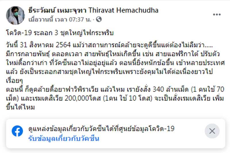 วันที่ 1 กันยายน 2564 นพ.ธีระวัฒน์ เหมะจุฑา หัวหน้าศูนย์วิทยาศาสตร์สุขภาพโรคอุบัติใหม่ คณะแพทยศาสตร์ โรงพยาบาลจุฬาลงกรณ์ ได้โพสต์ข้อความบนเฟซบุ๊ก ธีระวัฒน์ เหมะจุฑา Thiravat Hemachudha ว่า