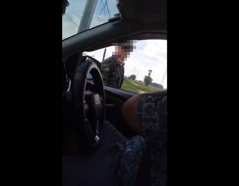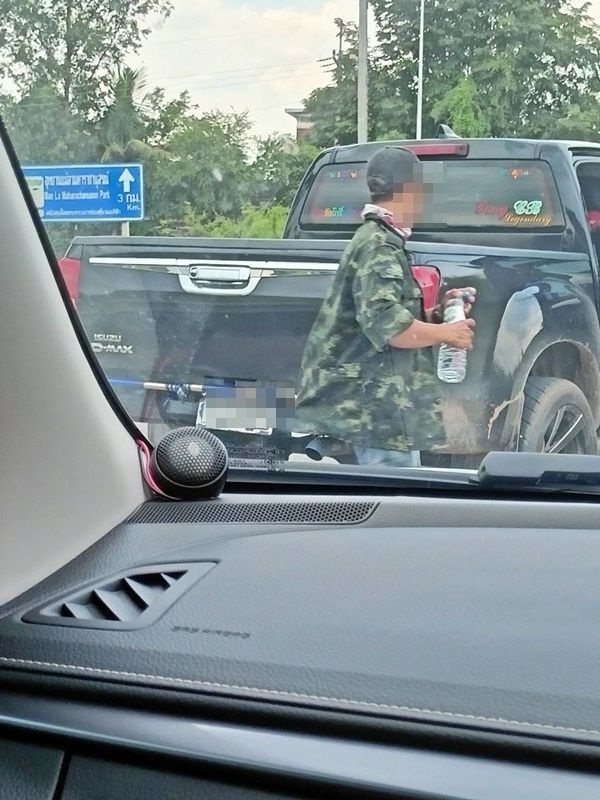 ผมบอกผมไปส่งลูกปลา เขาบอกกูก็มีปืนยิงปลาหลังรถ รถคู่กรณีนั้นทะเบียนกรุงเทพ ข้างหลังมีอุปกรณ์ตกปลา แต่ไม่ทราบว่าเขาเป็นคนที่ไหน ผมบอกผมไม่ได้จี้ เขาบอกว่ามึงสาบาน ผมบอกผมสาบาน เขาก็จะตีจนผมต้องยอมรับและขอโทษไปก่อน เพราะแฟนผมมาด้วยและสินค้าก็มีมูลค่าหลายบาท เขาโวยวายอยู่ประมาณ 10 นาที เอาปลาที่เขาตกได้มาวาง เอาปืนยิงปลาลงมา จากนั้นพอรถใหญ่มาเขาก็เก็บของก่อนเขายังด่าผมอีก ก่อนไป”