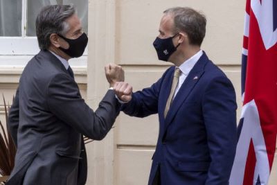 British Foreign Secretary Dominic Raab (R) meets with U.S. Secretary of State Antony Blinken ahead of the meeting of the Group of Seven (G7) foreign and development ministers in London, Britain, on May 3, 2021.