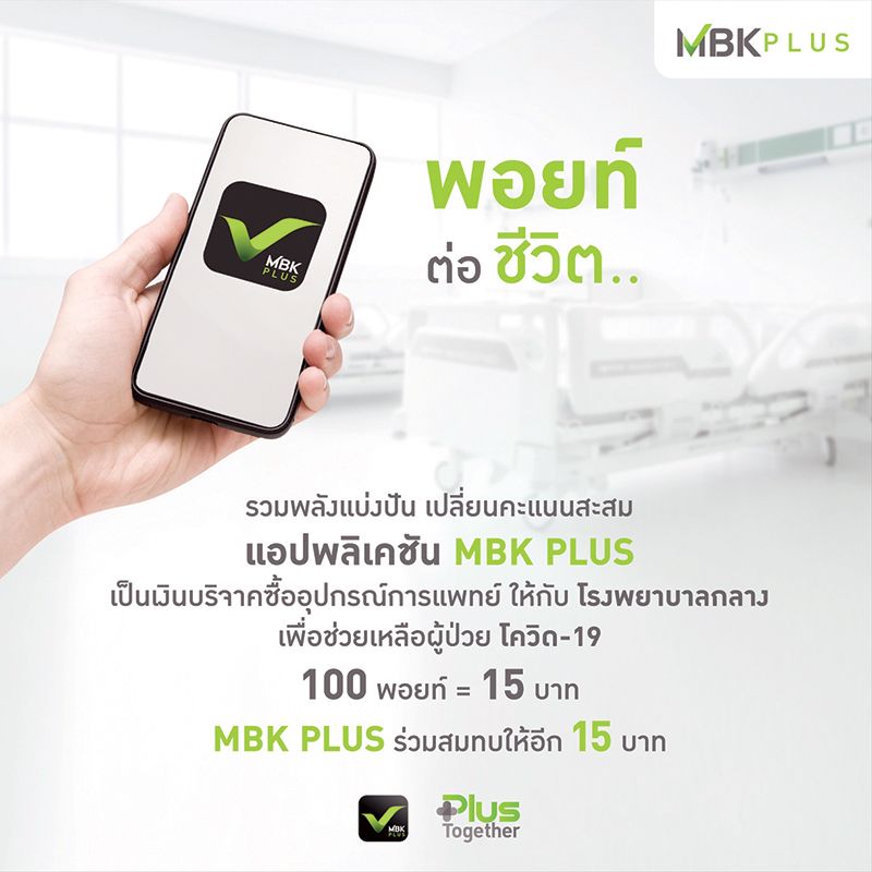 เอ็ม บี เค เห็นถึงความเสียสละของเหล่านักรบเสื้อกาวน์ ที่ทำหน้าที่อย่างเต็มกำลัง ได้มีอุปกรณ์ทางการแพทย์ที่มีประสิทธิภาพครบครันทั้งการป้องกันและช่วยเหลือผู้ป่วยติดเชื้อได้ทันท่วงที จึงได้จัด โครงการ PLUS TOGETHER พอยท์ต่อชีวิต พร้อมเชิญชวนสมาชิก MBK PLUS มาร่วมพลังแบ่งปันน้ำใจร่วมใจสู้ภัยโควิด-19 ด้วยการบริจาคคะแนน เอ็ม บี เคพอยท์ (MBK Points) ทุก 100 คะแนน เปลี่ยนเป็นเงินบริจาคมูลค่า 15 บาท และ MBK PLUS ร่วมสมทบทุนให้อีก 15 บาท เพื่อนำไปจัดซื้ออุปกรณ์การแพทย์มอบให้กับโรงพยาบาลกลาง ช่วยเหลือผู้ป่วยโควิด-19 รวมทั้งสนับสนุนการทำงานของบุคลากรทางการแพทย์เพียงแค่ดาวน์โหลดและสมัครแอปพลิเคชั่น MBK PLUS ทั้งระบบ iOS และ Android โดยไม่เสียค่าใช้จ่ายใดๆ ทั้งสิ้น ซึ่งสมาชิกใหม่จะได้รับคะแนนทันที 150 คะแนน และสามารถเข้าร่วมบริจาค โครงการ PLUS TOGETHER พอยท์ต่อชีวิต ได้ทันที ตั้งแต่ครั้งแรกที่สมัครยิ่งบริจาคคะแนนเท่าไหร่ MBK PLUS ยิ่งสมทบเพิ่มให้เท่านั้น เริ่มบริจาคได้ตั้งแต่ 100 คะแนน มีมูลค่าเท่ากับ15 บาท 200 คะแนน มีมูลค่าเท่ากับ 30 บาท 300 คะแนน มีมูลค่าเท่ากับ 45 บาท 400 คะแนน มีมูลค่าเท่ากับ 60 บาท