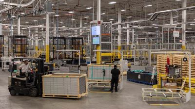 The whole process takes about four hours, after which the panels are loaded onto trucks for mostly domestic delivery.