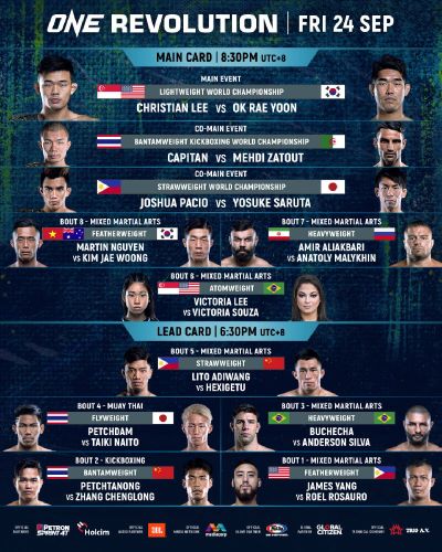 ONE: REVOLUTION happens live on Friday, September 24 at the Singapore Indoor Stadium and features three world title bouts.