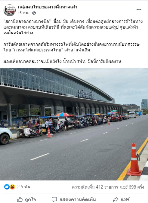 ในโลกออนไลน์ได้มีการแชร์ภาพพ่อค้าแม่ค้าตั้งแผงขายของยาวเหยียดบริเวณ “สถานีกลางบางซื่อ” ซึ่งเพิ่งสร้างไม่นานและถูกโปรโมตว่าจะเป็นฮับการขนส่ง เป็นหน้าเป็นตาของเมือง แต่ล่าสุดเพจเฟซบุ๊ก “กลุ่มคนไทยขอทวงคืนทางเท้า” ได้โพสต์ภาพและข้อความเชิงคำถามว่า “สถานีตลาดกลางบางซื่อ” ช็อป ชิม เดินทาง เชื่อมต่อศูนย์กลางการค้าริมทางและคมนาคม ครบจบที่เดียวที่นี่ ที่คุณจะได้สัมผัสความสวยแต่รูป จูบแล้วหัวเหม็นควันไก่ย่าง การันตีคุณภาพจากสลัมริมทางรถไฟที่เติบโตอย่างมั่นคงยาวนานนับทศวรรษโดย “การรถไฟแห่งประเทศไทย” เจ้าเก่าเจ้าเดิม มองเห็นอนาคตละว่าจะเป็นยังไง รฟท. ชื่อนี้การันตีผลงาน”