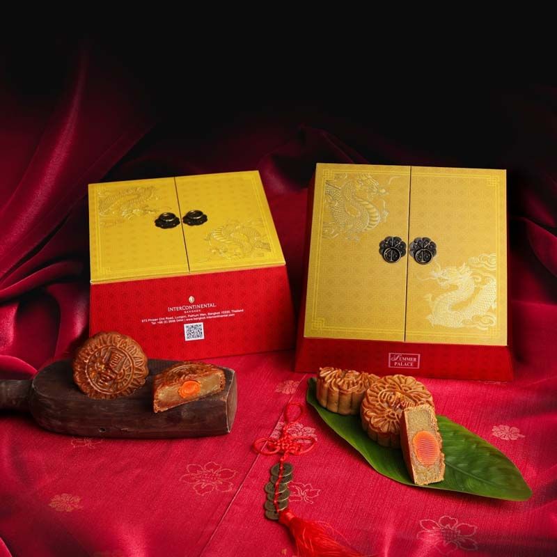 โรงเเรมอินเตอร์คอนติเนนตัล กรุงเทพฯ ขนมไหว้พระจันทร์สูตรต้นตำรับจากห้องอาหารซัมเมอร์ พาเลซ ที่คัดสรรเฉพาะวัตถุดิบชั้นเยี่ยม บรรจงปรุงอย่างพิถีพิถัน อบสดใหม่จากเตาทุกวัน ให้รสชาติที่กลมกล่อมด้วยเนื้อสัมผัสที่ละมุนลิ้น มีให้เลือก 4 รสชาติ (คัสตาร์ดไข่เดี่ยว พุทราจีนไข่เดี่ยว เม็ดบัวไข่เดี่ยว เเละทุเรียนไข่เดี่ยว) ราคาชิ้นละ 180 บาท ราคากล่อง 4 ชิ้นราคา 988 บาทและกล่อง 8 ชิ้น ราคา 1,388 บาท