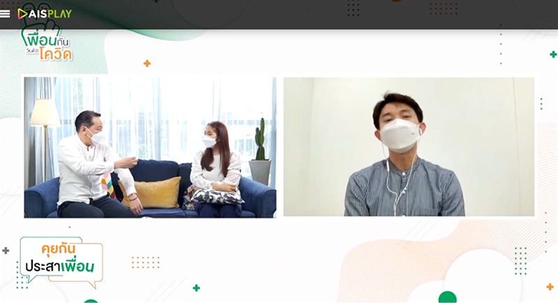 AIS โดย AIS PLAY จับมือร่วมกับ สสส.และภาคีเครือข่าย เปิดพื้นที่ให้คำปรึกษาและให้กำลังใจแบบเพื่อนถึงเพื่อน ผ่านรายการ “เพื่อนกันวันติดโควิด” จัดเต็มด้วยคอนเทนต์สาระความรู้จากผู้เชี่ยวชาญในหลายสาขา อาทิ บุคลากรทางการแทพย์ นักวิชาการ ศิลปิน ดารา สื่อมวลชน รวมไปถึงผู้ที่เคยติดโควิด-19 ที่พร้อมจะมาเป็นเพื่อนและให้คำแนะนำดีๆ เพื่อบรรเทาความทุกข์จาก