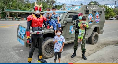 Troops, dressed up as Japanese “Kamen Rider” superheroes, travelled around Narathiwat’s Joh I Rong district on Thursday to distribute snacks, stationery and vegetables.