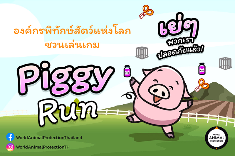 องค์กรพิทักษ์สัตว์แห่งโลก ประเทศไทย(World Animal Protection) เดินหน้ายกระดับสวัสดิภาพสัตว์ต่อเนื่อง พร้อมชวนคนไทยร่วมแก้ปัญหาสวัสดิภาพสัตว์ในฟาร์มผ่านการร่วมเล่นเกม “Piggy Run” ซึ่งเป็นส่วนหนึ่งของการสร้างความตระหนักรู้ให้กับประชาชนเพื่อนำมาสู่การผลักดันด้านสวัสดิภาพสัตว์และยกเลิกการใช้ยาปฏิชีวนะเพื่อป้องกันโรคแบบรวมกลุ่มในสัตว์ฟาร์มอันจะส่งผลต่อการเกิดวิกฤตเชื้อดื้อยาที่เป็นอันตรายต่อชีวิตคนจำนวนมาก