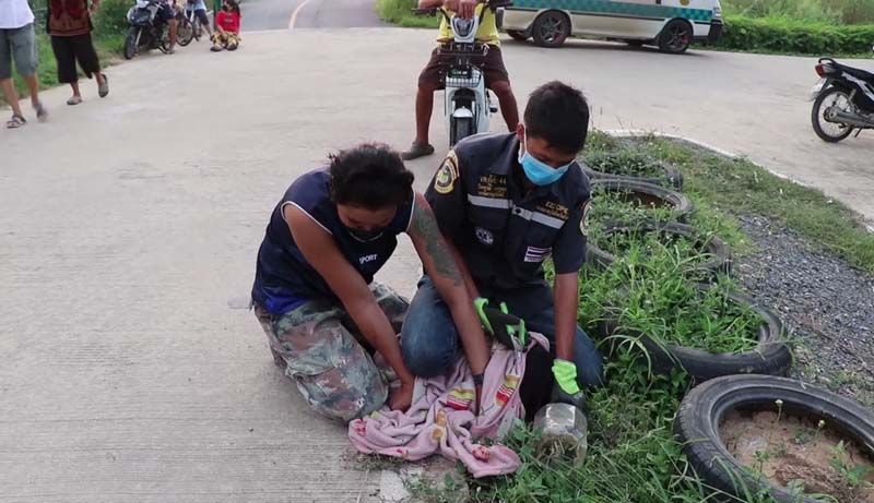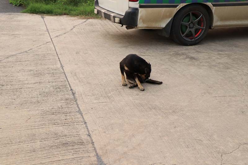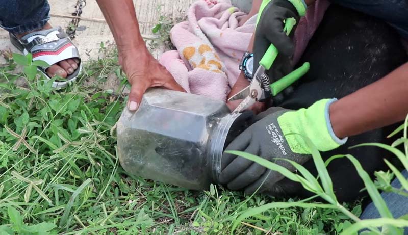 ด้านนายไพรทูรย์ พลธุสะ เจ้าหน้าที่กู้ภัย เล่าให้ฟังว่า ได้รับแจ้งจากชาวบ้านขอความช่วยเหลือสุนัขจรจัด ที่พลาดท่าหัวติดอยู่ในกระป๋องพลาสติกแล้วนำหัวออกมาไม่ได้นาน2วันแล้วที่ต้องอดน้ำอดข้าวหวั่นจะตายในที่สุด จึงเข้ามาตรวจสอบพบว่าเป็นหมาเพศเมีย หัวติดกระป๋องอยู่ในอาการอ่อนแรง คาดว่าหาอาหารกินแล้วไปพบเห็นกระป๋องพลาสติก ที่มีกลิ่นอาหารอยู่ ก่อนมุดหัวลงไปแล้วออกไม่ได้ จึงทำการไล่ต้อนจับได้แล้วทำการใช้กรรไกรตัดกระป่องออกจากหัวหมาได้อย่างปลอดภัย และเจ้าหมาก็วิ่งออกไปด้วยความดีใจ. -008