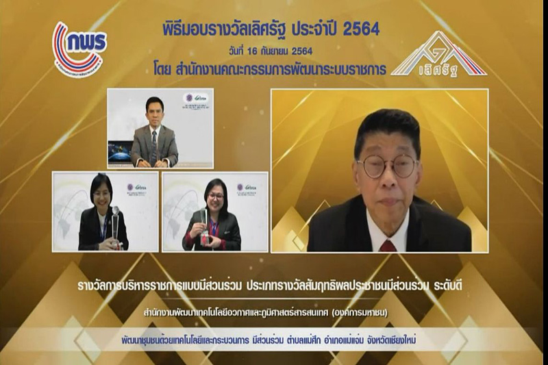 16 กันยายน 2564 สำนักงานพัฒนาเทคโนโลยีอวกาศและภูมิสารสนเทศ (องค์การมหาชน) หรือ GISTDA รับมอบรางวัลเลิศรัฐ ประจำปี 2564 ผ่านสื่ออิเล็กทรอนิกส์ โดยมีรองนายกรัฐมนตรี นายวิษณุ เครืองาม เป็นประธานในพิธี และ GISTDA ได้ 2 รางวัลจากรางวัลบริการภาครัฐระดับดี ประเภทนวัตกรรมการบริการ ผลงาน “ระบบชี้จุดไฟป่าเพื่อการลด PM 2.5 ด้วยเทคโนโลยีภูมิสารสนเทศ” และรางวัลบริหารราชการแบบมีส่วนร่วมระดับดี ประเภทรางวัลสัมฤทธิผลประชาชนมีส่วนร่วม ผลงาน “พัฒนาชุมชนด้วยเทคโนโลยีและกระบวนการมีส่วนร่วมตำบลแม่ศึก อำเภอแม่แจ่ม จังหวัดเชียงใหม่ ”