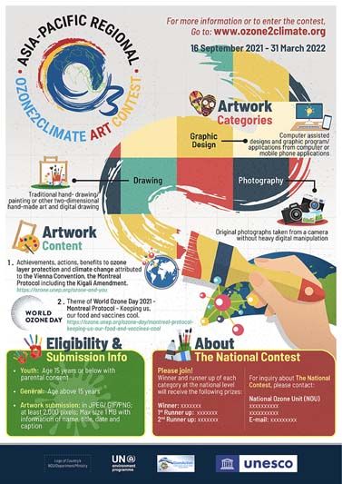 ซึ่งการประกวดจะแบ่งเป็น 3 ประเภท คือ ภาพถ่าย, ภาพวาด, และกราฟิกดีไซน์ เพื่อเตือนชาวโลกให้ตระหนักถึงปัญหาชั้นโอโซนในบรรยากาศที่ถูกทำลาย และภัยโลกร้อน ซึ่งนำไปสู่วิกฤตสภาพภูมิอากาศที่เปลี่ยนแปลง จากการใช้สารเคมีที่ส่งผลกระทบต่อสิ่งแวดล้อม “เชิญชวนส่งผลงานออกแบบศิลปะซึ่งเปิดรับสมัครให้ผู้สนใจสามารถส่งผลงานได้ตั้งแต่ 16 กันยายน 2564-31 มีนาคม 2565” โดยมีบุคคลชั้นนำจากสหประชาชาติและเยาวชนคนรุ่นใหม่ด้านสิ่งแวดล้อมร่วมงานเปิดตัว