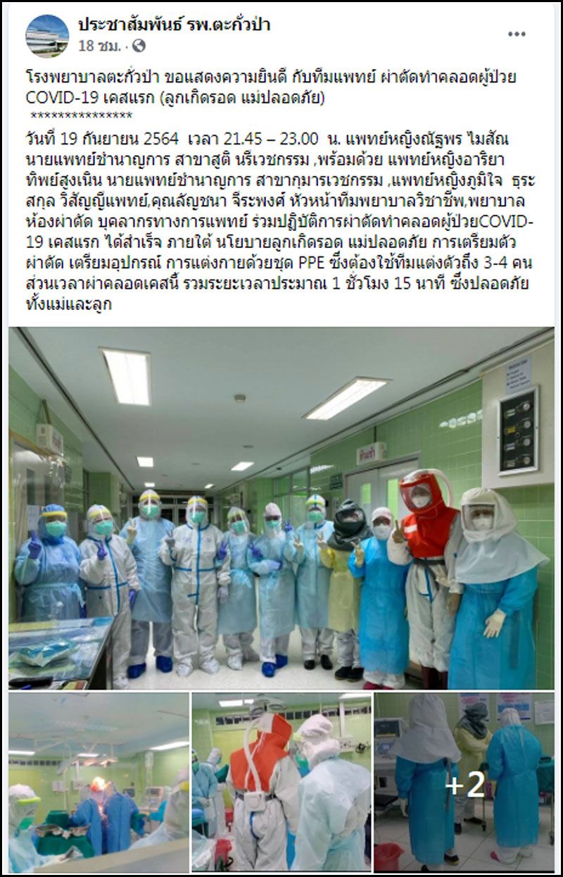 เฟซบุ๊ก ประชาสัมพันธ์โรงพยาลตะกั่วป่า อ.ตะกั่วป่า จ.พังงา ได้โพสต์เรื่องราวสุดประทับใจว่าเมื่อคืนวันที่ 19 ก.ย.64 เมื่อเวลา 21.45 – 23.00 น. ทางทีม แพทย์หญิงณัฐพร ไมสัณ นายแพทย์ชำนาญการ สาขาสูติ นรีเวชกรรม พร้อมด้วย แพทย์หญิงอาริยา ทิพย์สูงเนิน นายแพทย์ชำนาญการ สาขากุมารเวชกรรม แพทย์หญิงภูมิใจ ธุระสกุล วิสัญญีแพทย์ คุณลัญชนา จีระพงศ์ หัวหน้าทีมพยาบาลวิชาชีพ พยาบาลห้องผ่าตัด บุคลากรทางการแพทย์ ร่วมปฏิบัติการผ่าตัดทำคลอดผู้ป่วย COVID-19 เคสแรก ได้สำเร็จ ภายใต้ นโยบายลูกเกิดรอด แม่ปลอดภัย การเตรียมตัวผ่าตัด เตรียมอุปกรณ์ การแต่งกายด้วยชุด PPE ซึ่งต้องใช้ทีมแต่งตัวถึง 3-4 คน ส่วนเวลาผ่าคลอดเคสนี้ รวมระยะเวลาประมาณ 1 ชั่วโมง 15 นาที ซึ่งปลอดภัยทั้งแม่และลูก.