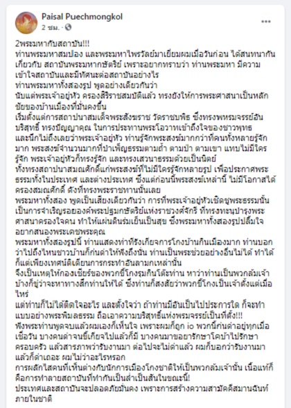 21 กันยายน 2564 นายไพศาล พืชมงคล อดีตกรรมการผู้ช่วยรองนายกรัฐมนตรี (พล.อ.ประวิตร วงษ์สุวรรณ) โพสต์ข้อความผ่านเฟซบุ๊ก หัวข้อ “2พระมหากับสถาบัน!!!” มีเนื้อหาดังนี้…