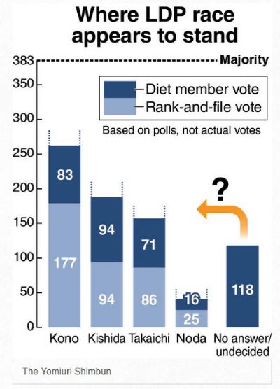 As for the LDP’s Diet members, a separate poll appears to show their preference for Kishida, Kono, Takaichi and Noda in that order.