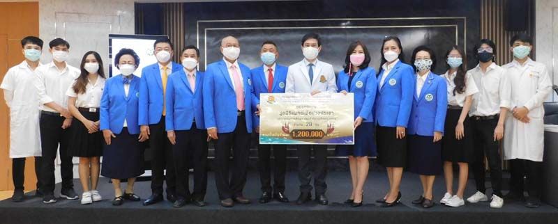 รศ.นพ.ดิลก ภิยโยทัย คณบดีคณะแพทยศาสตร์ มธ. รับมอบเงินบริจาคจาก ดร.สุรชัย สุทธิวรชัย ประธานมูลนิธิทุนแพทย์เพื่อปวงประชา มี อานุภาพ ธีรณิศรานนท์, ศศกร แผ่ดิลกกุล, ยุทธเมธากรณ์อภิจิระโภคี และคณะ กรรมการมูลนิธิฯ ร่วมด้วย