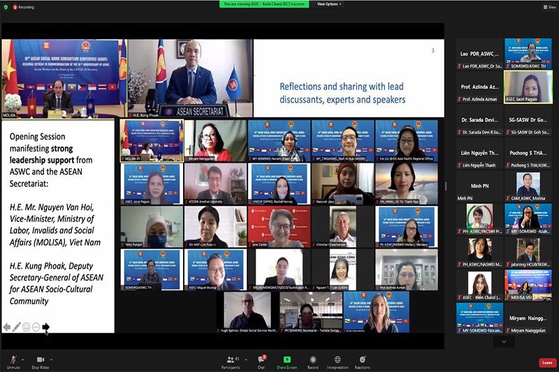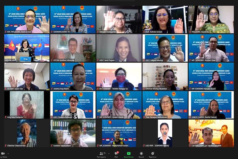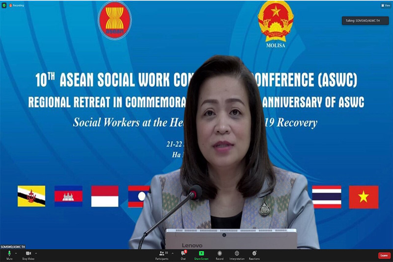 23 กันยายน 2564 ที่ห้องประชุม ชั้น 2 กระทรวงการพัฒนาสังคมและความมั่นคงของมนุษย์ สะพานขาว ถนนกรุงเกษม กทม. นางจตุพร โรจนพานิช ผู้ตรวจราชการกระทรวงการพัฒนาสังคมและความมั่นคงของมนุษย์ ได้รับมอบหมายจากนางพัชรี อาระยะกุล ปลัดกระทรวงการพัฒนาสังคมและความมั่นคงของมนุษย์ (ปลัด พม.) ให้เข้าร่วมการประชุมภาคีเครือข่ายด้านสังคมสงเคราะห์อาเซียน ครั้งที่ 10 (10th ASEAN Social Work Consortium Conference – ASWC) ในฐานะเจ้าหน้าที่อาวุโสอาเซียนด้านสวัสดิการสังคมและการพัฒนาของประเทศไทย (SOMSWD Leader of Thailand) ซึ่งกระทรวงแรงงาน คนพิการ และกิจการสังคม (Ministry of Labour, Invalids and Social Affairs – MOLISA) สาธารณรัฐสังคมนิยมเวียดนาม ในฐานะประธานการประชุม ASWC ประจำปี พ.ศ. 2563 – 2564 โดยจัดขึ้นเป็นวันที่ 2 ต่อเนื่องจากวันที่ 21 กันยายน 2564 ผ่านระบบการประชุมทางไกล