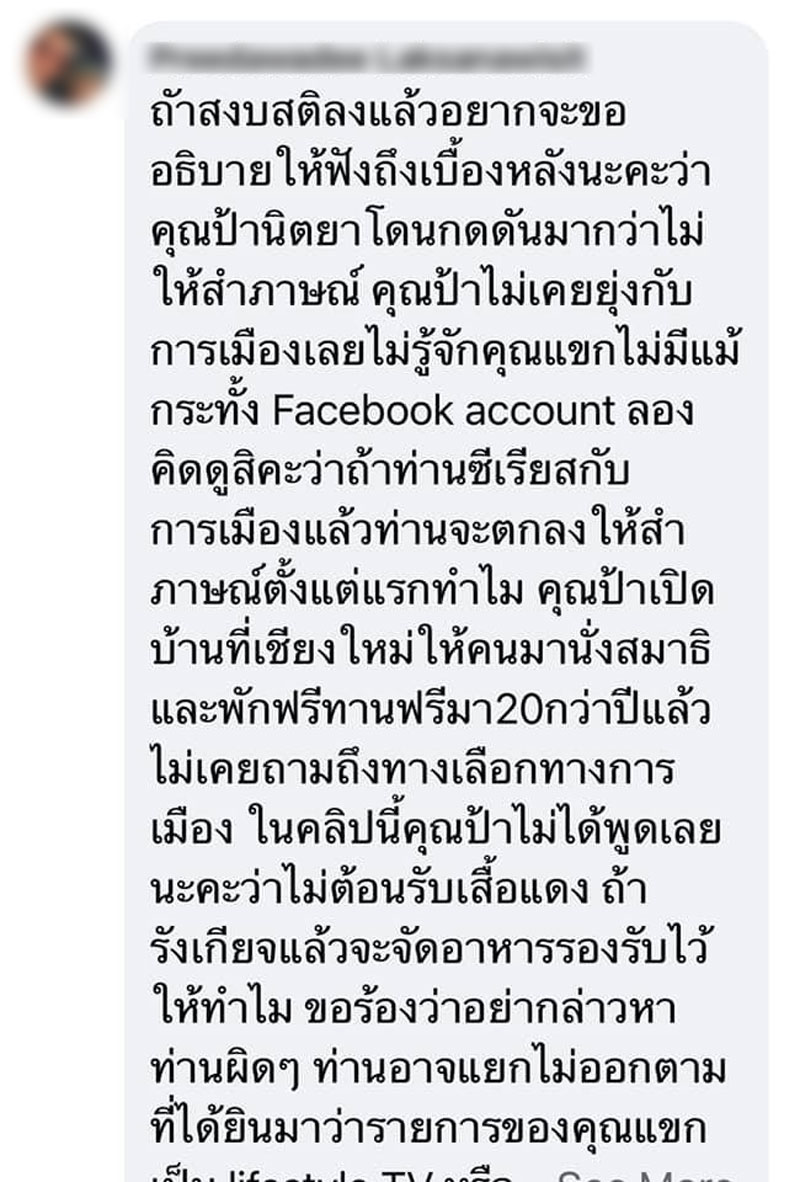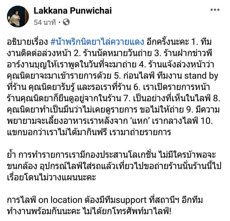 ล่าสุด แขก คำผกา ชี้แจงผ่านเฟซบุ๊กอีกครั้ง มีข้อความว่า อธิบายเรื่อง #น้ําพริกนิตยาไล่ควายแดง อีกครั้งนะคะ 1. ทีมงานติดต่อล่วงหน้า 2. ร้านนัดหมายวันถ่าย 3. ร้านฝากข่าวพีอาร์งานบุญให้เราพูดในวันที่จะมาถ่าย 4. ร้านแจ้งล่วงหน้าว่าคุณนิตยาจะมาเข้ารายการด้วย 5. ก่อนไลฟ์ ทีมงาน stand by ที่ร้าน คุณนิตยารับรู้ และรอเราที่ร้าน 6. เราเปิดรายการหน้าร้านคุณนิตยาก็ยืนดูอยู่จากในร้าน 7. เป็นอย่างที่เห็นในไลฟ์ 8. คุณนิตยาทำเป็นมึนว่าไม่เคยดูรายการ ขอไม่ให้ถ่าย 9. มีความพยายามจะเลี้ยงอาหารเราหลังจาก ‘แหก’ เรากลางไลฟ์ 10. แขกบอกว่าเราไม่ได้มากินฟรี เรามาถ่ายรายการ